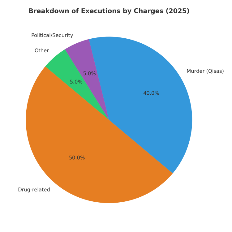 According to the Iran Human Rights Monitor, 40% of those executed in Iran in 2025 were charged with “murder,” and 50% were executed on charges related to “narcotics.”