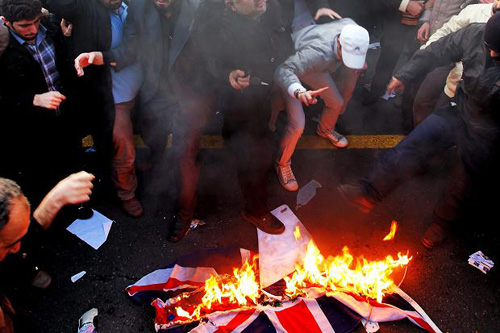 Protesters stormed the main British embassy in downtown Tehran on Tuesday, smashing windows, torching a car and burning the British flag. At the same time, another group broke into a British diplomatic residential compound at Qolhak in north Tehran which used to be the embassy’s summer quarters.