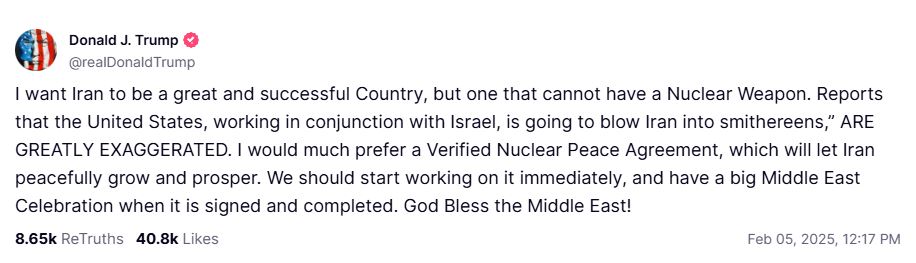 Donald Trump, the President of the United States, stated in a message on the social media platform Truth Social that he desires “a great and successful Iran,” but nuclear weapons should not be part of that future. He also called for a new nuclear agreement with the Iranian regime.